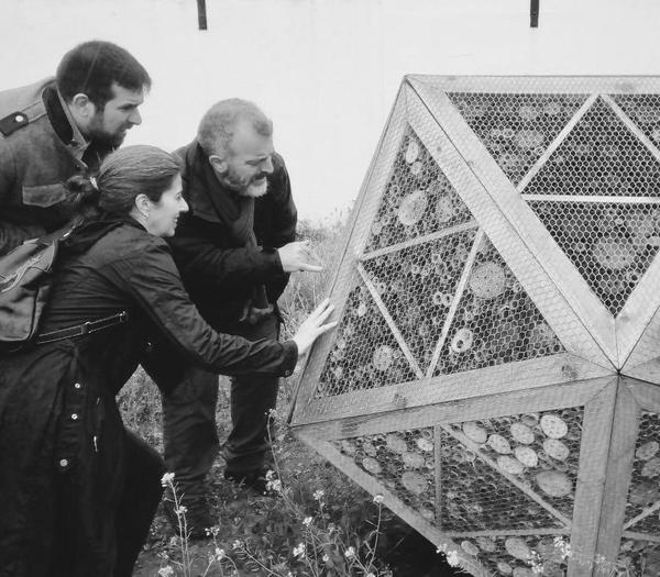 Una tarde ya finalizada la exposición de Luces de barrio en la casa Murillo y comenzado el 2018, Javier Real (nuestro carpintero), Tamara y yo volvimos a montar el hotel de insectos con forma de icosaedro en el huerto del colegio Andalucía en el Polígono Sur.